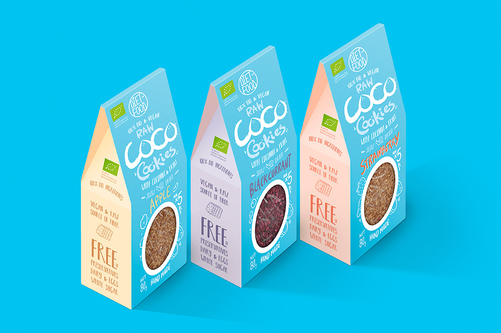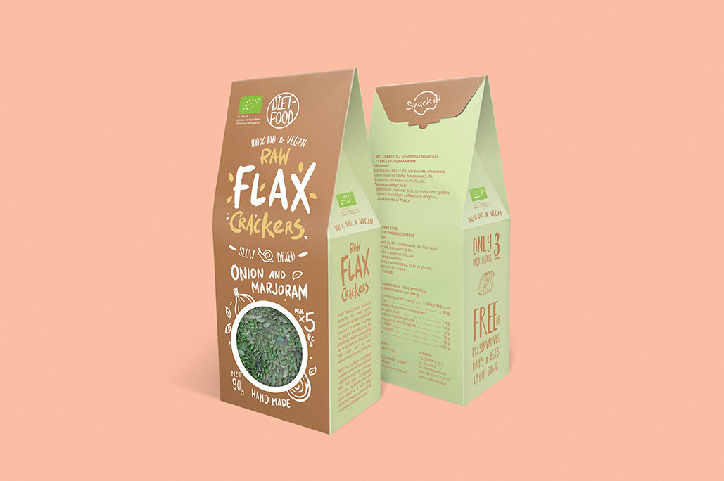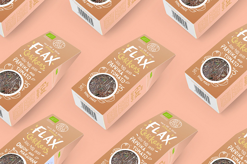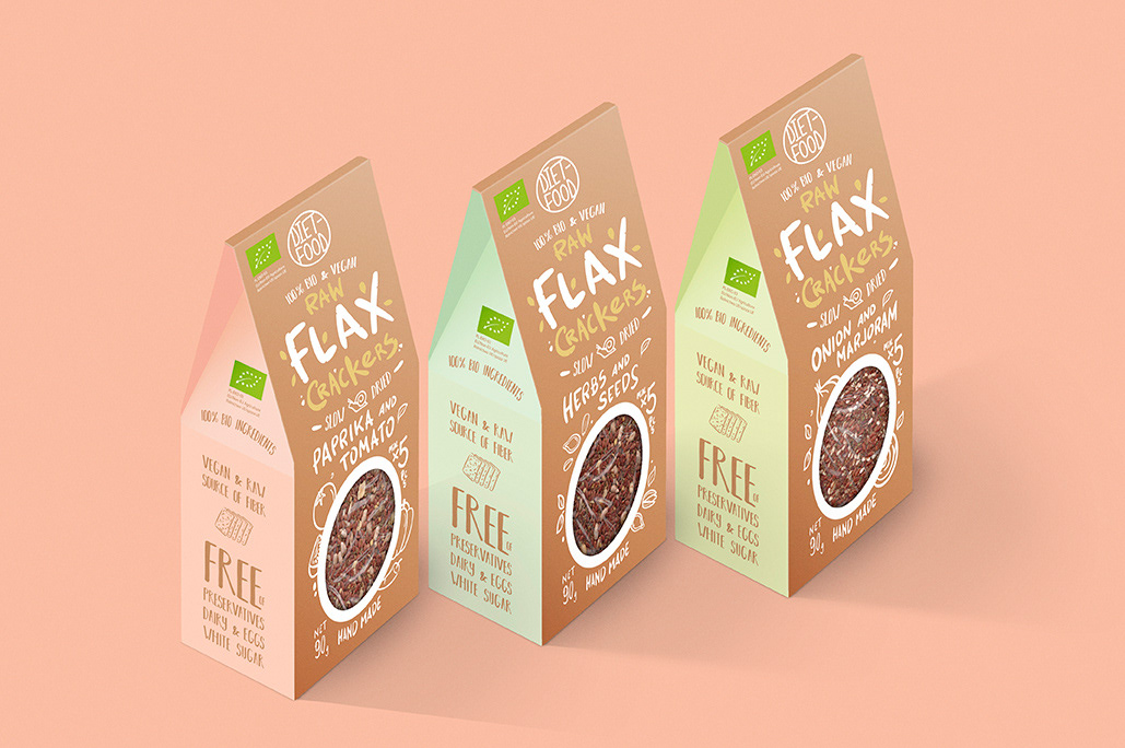 Organic cookies and crackers packaging with hand-drawn fonts.
